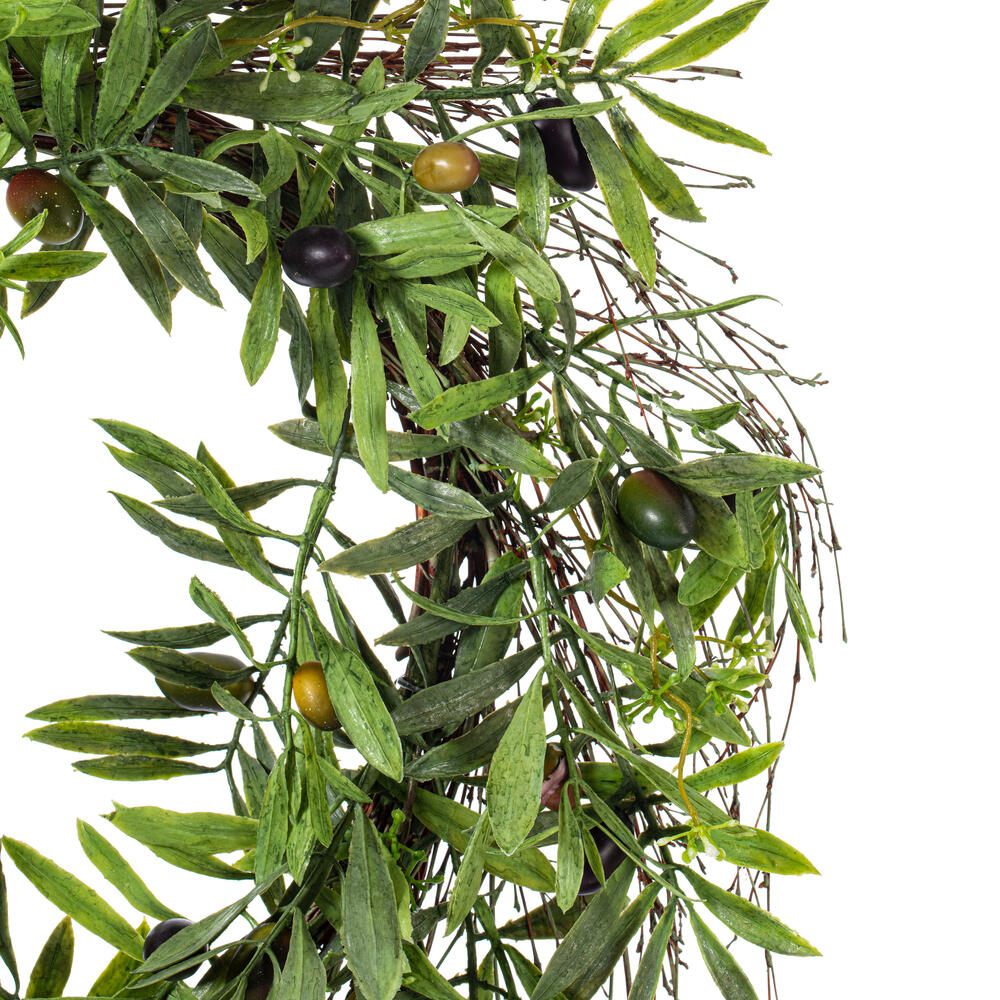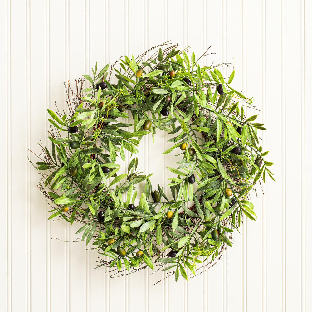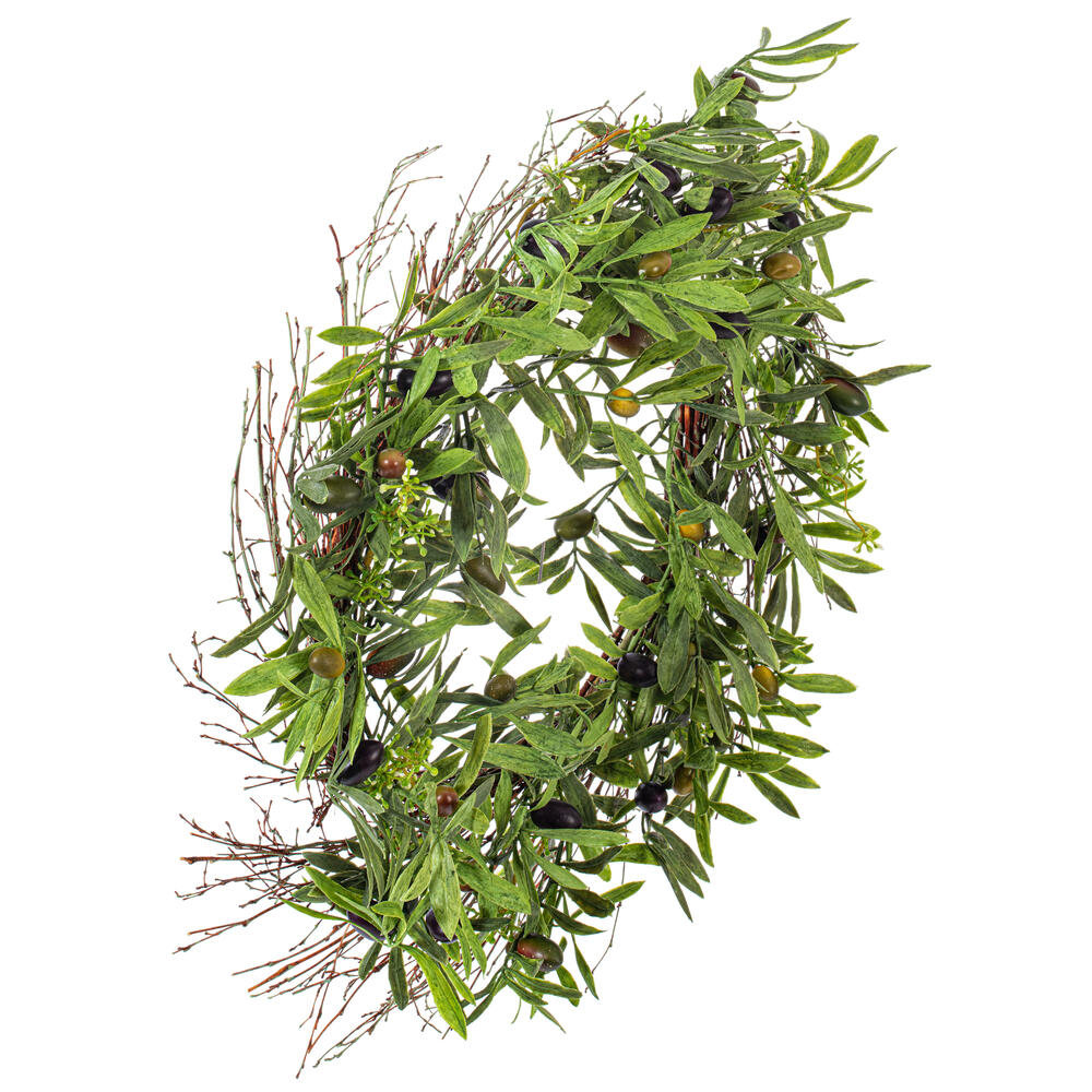 Vickerman 24″ Artificial Green Olive Leaf Wreath. Bring the warm feeling of the Mediterranean into your home with Vickerman’s 24-inch Green Faux Olive Leaf Wreath. This realistic faux wreath is perfect for adding a touch of greenery to your decor. Use it for wall decorations, over your mantel, or in any other room in your home to bring the outdoors inside. Perfect for indoor use, this maintenance-free faux wearth is easy to keep looking fresh with just a quick wipe of a dry cloth. Whether you’d like to add a touch of nature to your living room, bedroom, or office, this faux olive plant is the perfect choice for your plant decor.