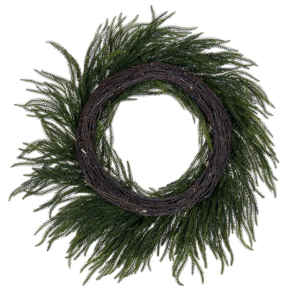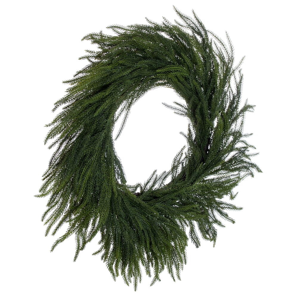 28″ Green Norfolk Pine Wreath. It measures 28 inches wide. One piece per box.