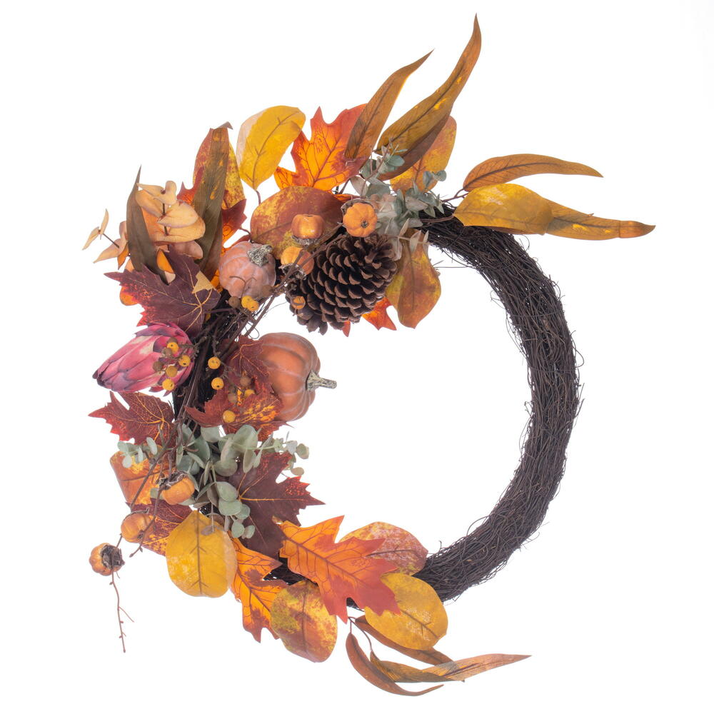 CompareAdd to wishlistVickerman 28″ Orange Pumpkin Eucalyptus Pinecone Half Wreath. The wreath features a grapevine base, mini pumpkins, pinecones, harvest leaves, protea, eucalyptus leaves, and orange berries.